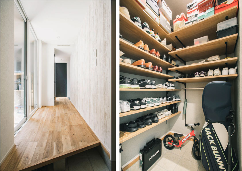 あとは、玄関上がってすぐの場所につくった物置スペースですね。