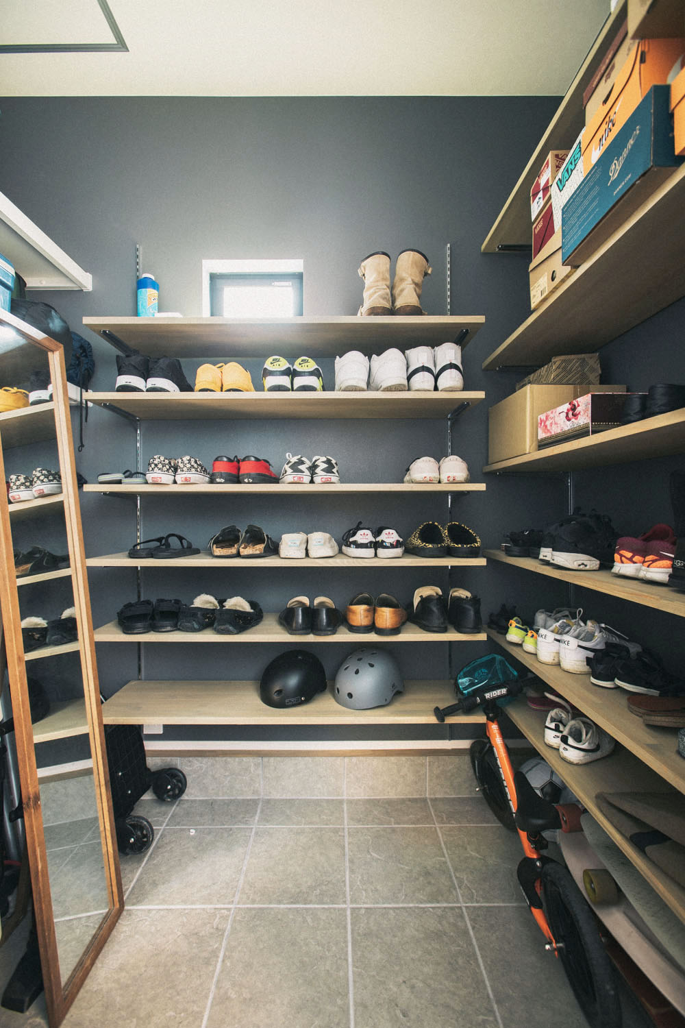 シューズクロークも、アウトドア用品を収納できるようにと広めに設計した。