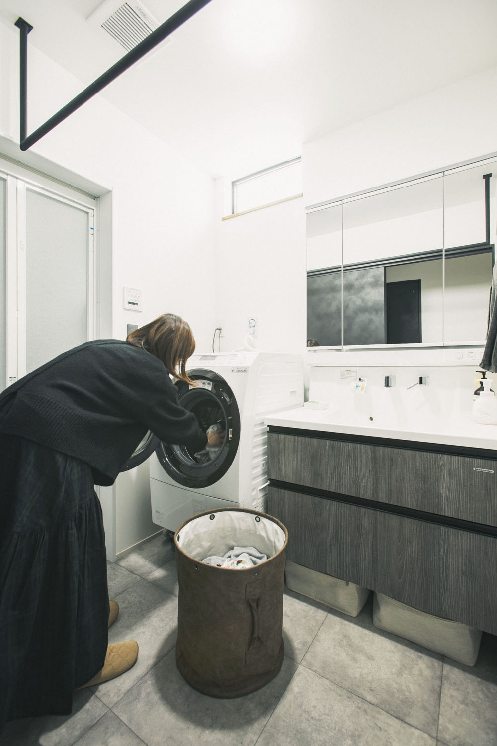 洗濯乾燥機が置いてある洗面脱衣室と、ファミリークロークを隣接させることで、